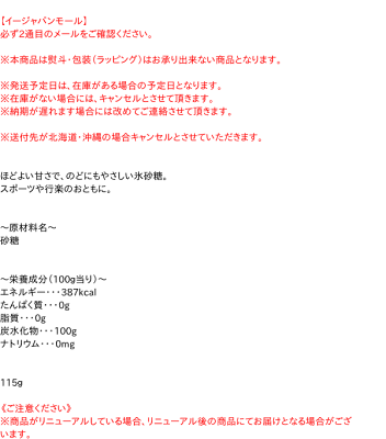 〜原材料名〜 砂糖 〜栄養成分(100g当り)〜 エネルギー・・・387kcal たんぱく質・・・0g 脂質・・・0g 炭水化物・・・100g ナトリウム・・・0mg 115g【広告文責】株式会社イージャパンアンドカンパニーズ 072-875-6666《ご注意ください》 ※商品がリニューアルしている場合、リニューアル後の商品にてお届けとなる場合がございます。