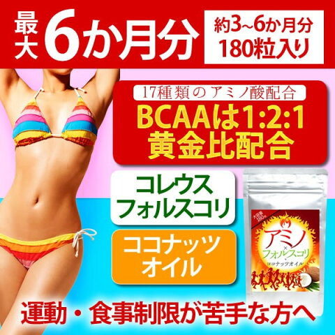 \\最大6か月分// アミノ×フォルスコリ+ココナッツオイル 《180粒約3〜6か月分》 17種類のアミノ酸配合 BCAAは1:2:1の黄金比 フォルスコリとココナッツオイルも そのほかにも酵素、乳酸菌、ラクトフェリン、唐辛子、ヒハツ、カルニチン、ガルシニア、生コーヒー豆抽出物、茶抽出物など、運動などでもっと燃えたい方をサポートする成分もたっぷり配合! 【厳選成分】 ●BCAA 分岐鎖(ぶんきさ)アミノ酸と呼ばれ、必須アミノ酸であるバリン、ロイシン、イソロイシンを黄金比で配合! (1粒中:バリン5mg、ロイシン10mg、イソロイシン5mg) ●コレウスフォルスコリ抽出物(1粒中:10mg) インドやネパールに自生するシソ科の植物で、様々な健康サポートが期待されています ●ココナッツオイル 中鎖脂肪酸や話題のラウリン酸などを含む、美容&健康に◎の天然食品 「燃える」ための成分もたっぷり ●酵素 果実や野菜、穀物、野草、糖類や海藻類など多彩な食物の栄養やパワーを酵素の力でギュッと引き出しました ●乳酸菌 毎日のスッキリやお腹ケアのために乳酸菌の殺菌乳酸菌体を配合しました ●ラクトフェリン 中高年から赤ちゃんまで、広い世代から注目されている機能性タンパク質 ●唐辛子 燃えたい方にオススメ!辛味成分であるカプサイシンが含まれ、様々な健康食品で活躍しています ●ヒハツ 「ナガコショウ」「ロングペッパー」とも呼ばれるコショウの仲間で古くから健康を助けるハーブとして用いられています ●カルニチン ダイエット中の不足しがちな栄養サポートとしてもオススメの成分です! ●ガルシニア オトギリソウ科フクギ属の植物で、マンゴスチンの一種。