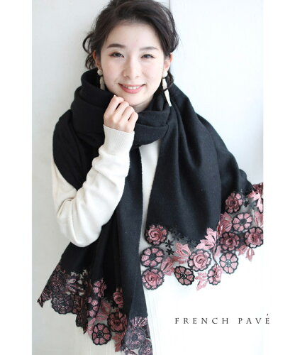 【再入荷♪11月17日12時&22時より】(ブラック)「FRENCH PAVE」上質な肌触り。立体花刺繍のストール